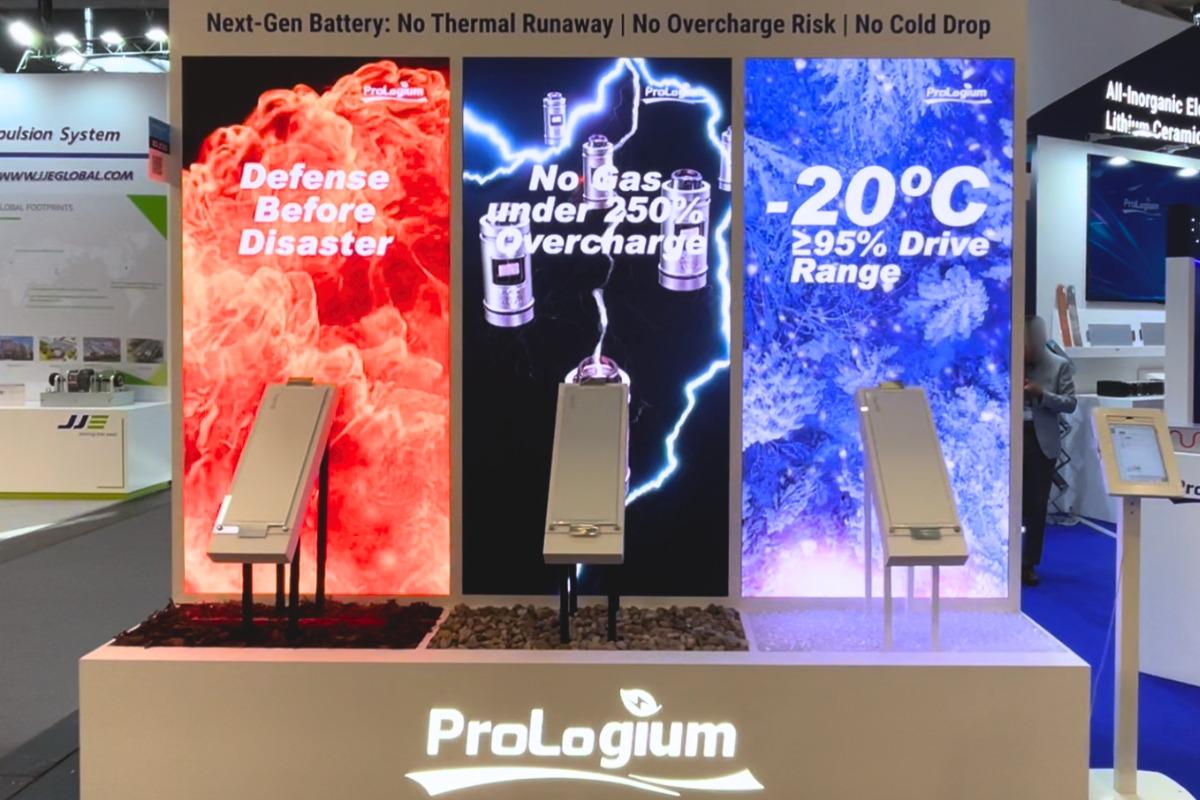 王一為輝能(ProLogium)設計動態影像,搭配三個LED螢幕呈現出大氣視覺感。