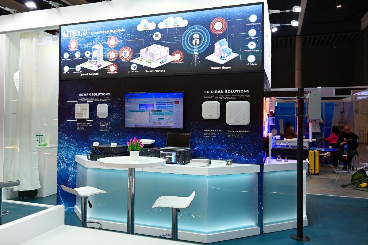 展攤中結合產品牆、產品說明海報與電視螢幕多方位介紹企業產品特色。